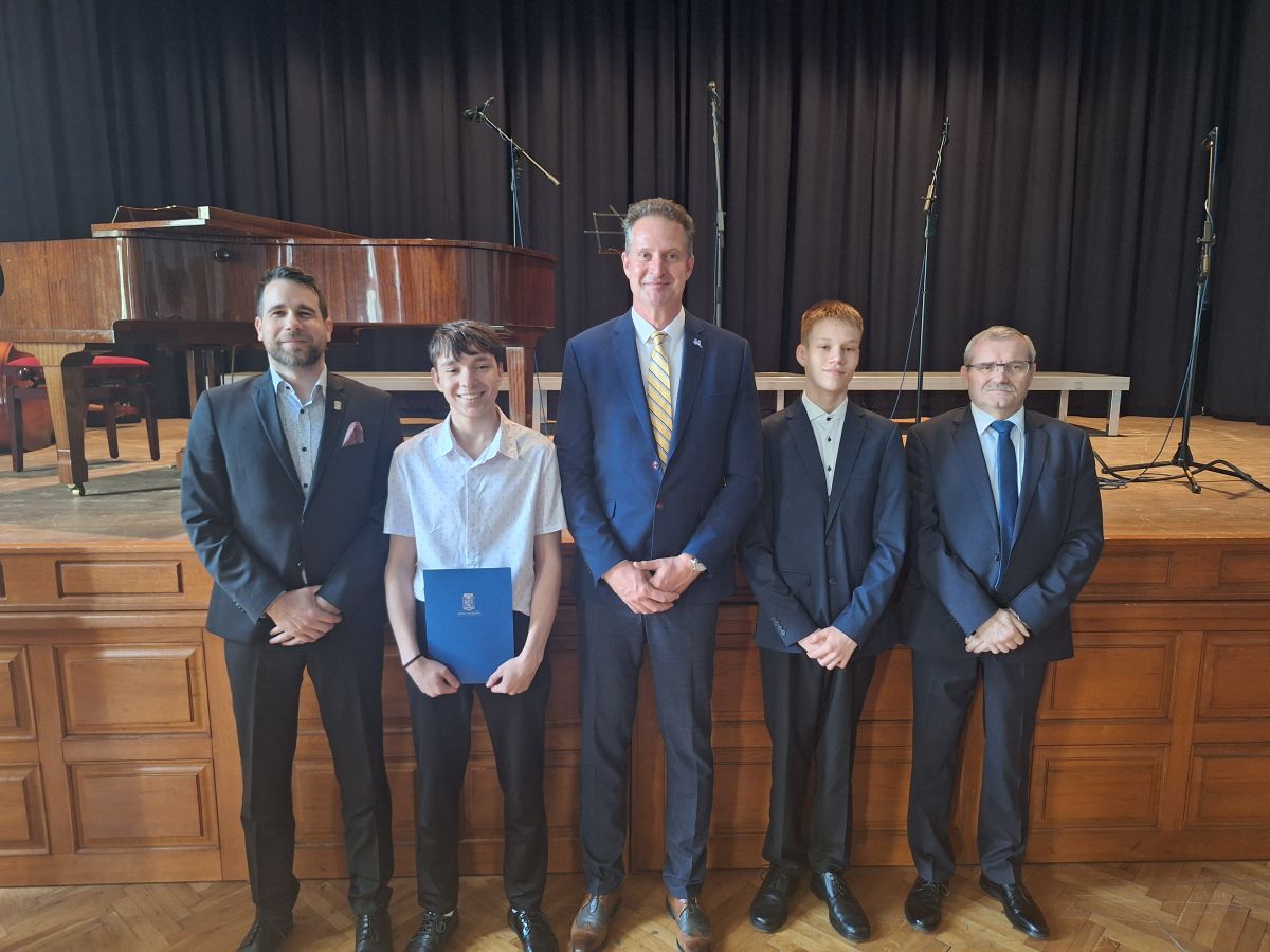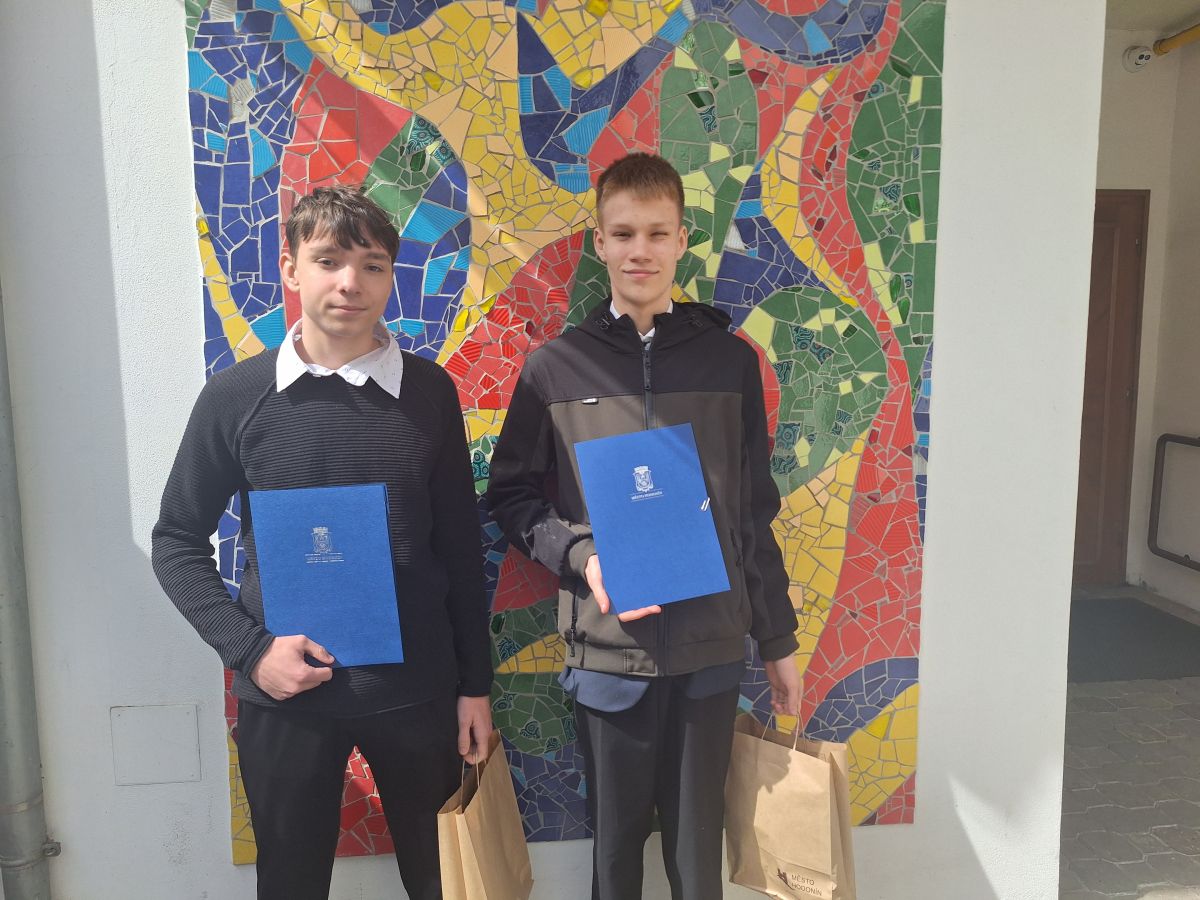 Dne 23. 4. 2026 se žáci naší školy zúčastnili slavnostního ocenění nejlepších žáků a studentů hodonínských základních a středních škol v sále Evropa. Naši školu zastoupili Marek Světnica z 9. C a Vojtěch Kašík, taktéž z 9. C. Poděkování a ocenění za jejich práci jim předali představitelé města Hodonína – pan starosta Libor Střecha, pan místostarosta Ing. Ondřej Fialík a pan místostarosta Vojtěch Salajka. Žákům děkujeme za výborné studijní i pracovní výsledky a přejeme jim mnoho úspěchů v dalším studiu na SŠ.“